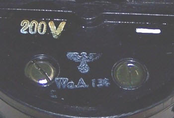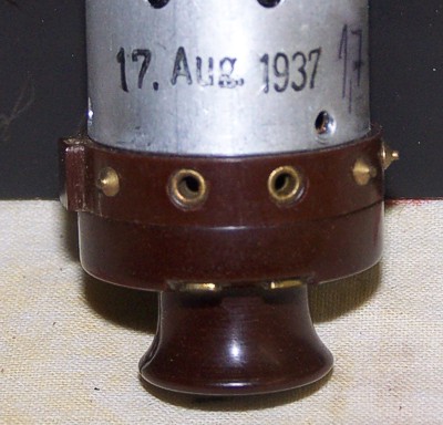 De aansluitingen zijn gevat in een bakelieten voet en het glaswerk zit ingepakt in een metalen omhulsel.