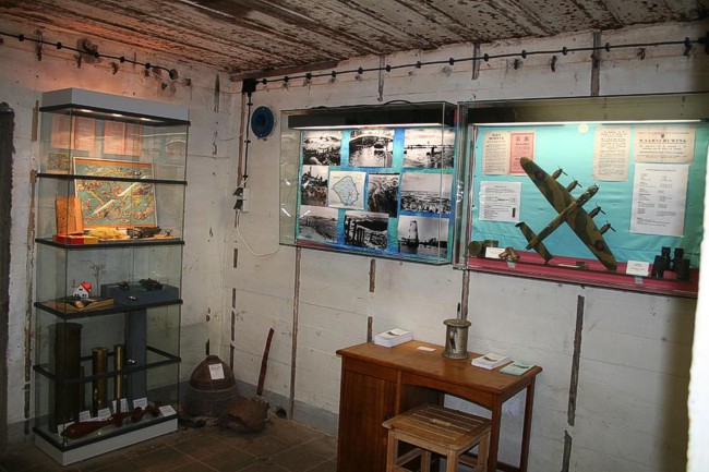In de linker vitrine een groot model van de Lancasterbommenwerper, in de outfitt zoals hij op Westkapelle