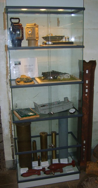 In de vitrine modellen van landingsvaartuigen en wat onderdelen van munitie.