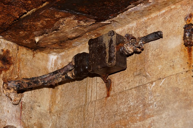 De bakeliete kabeldoos zit hier ook op een wandbeugeltje.