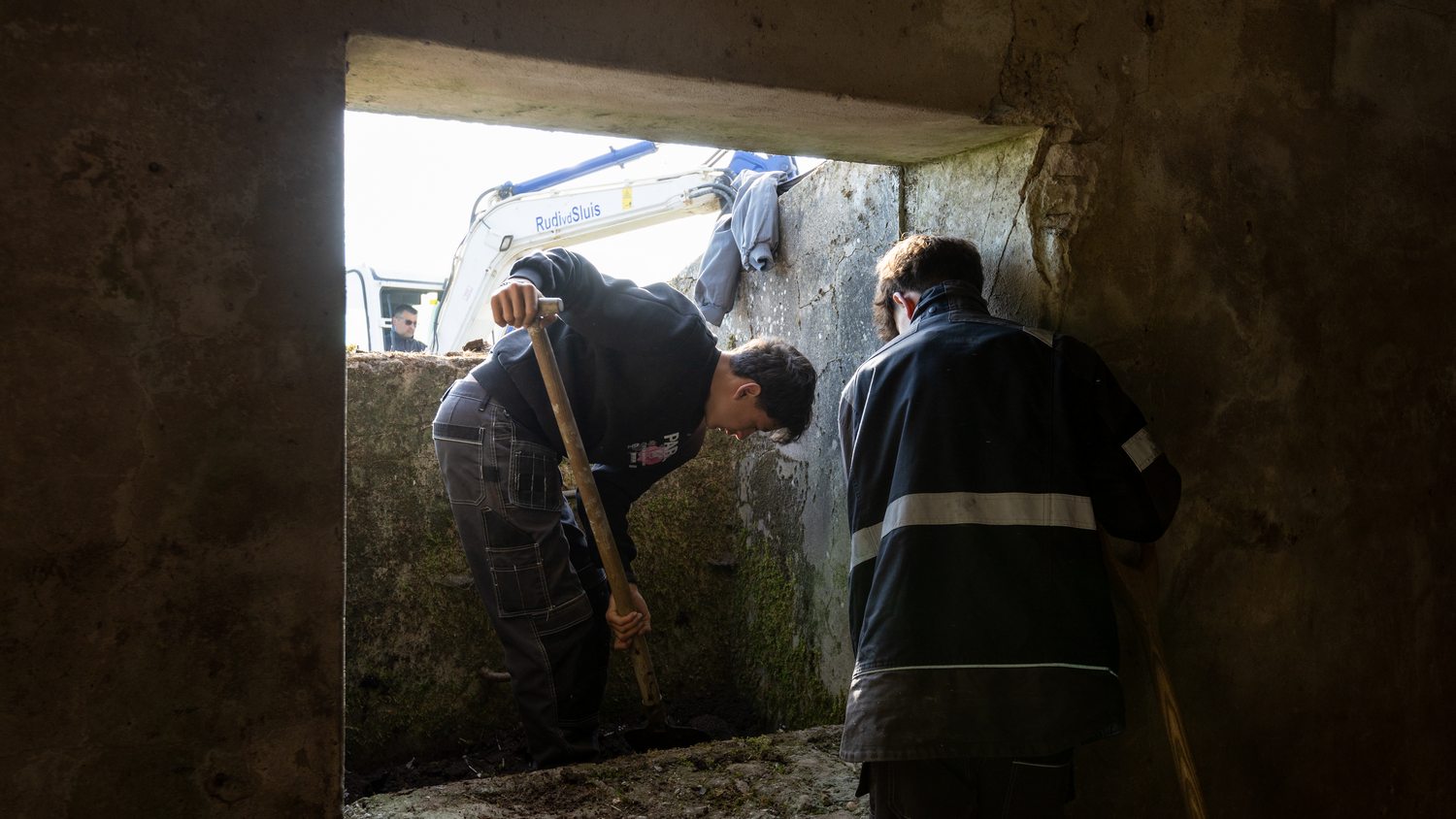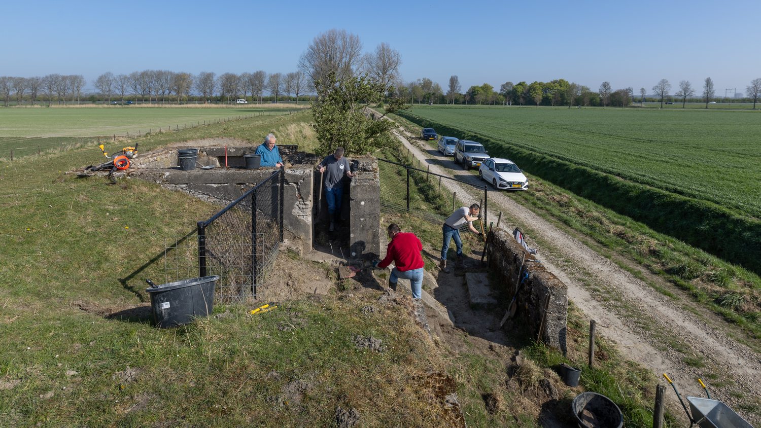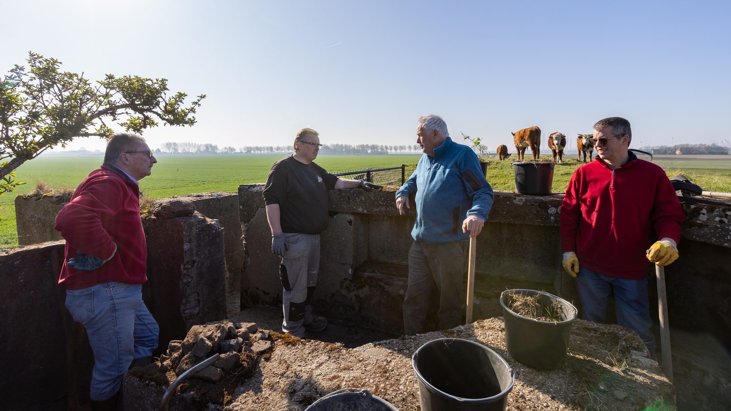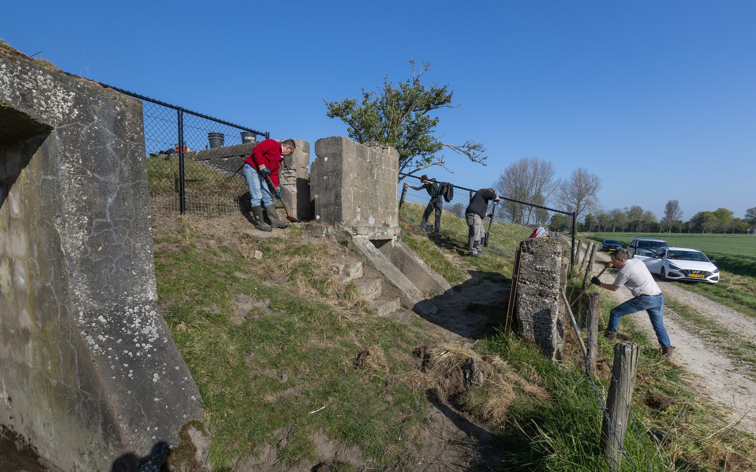 Er is nieuw hekwerk geplaatst en vrijwilligers hebben de bunker vrij gemaakt van puin en koeienmest. Rudi van de Sluis van het grondverzetbedrijf in Lewedorp, kwam kosteloos een ochtend met een kraan werken. De buurvrouw van ‘Het Okkeneutje’ ondersteunde ons met koffie en een bolus.