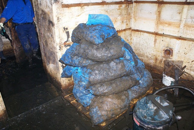 Hier is het restant aan steenkolen uit de kachelruimte ingepakt. Het ligt in
