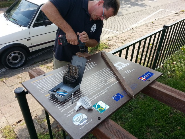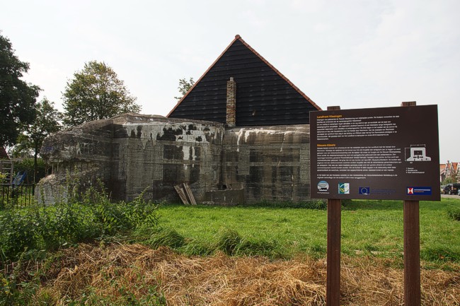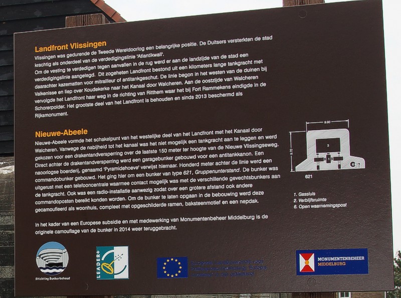 Het staat langs de stoep, zodat de voorbijganger de bunker op de achtergrond ziet.