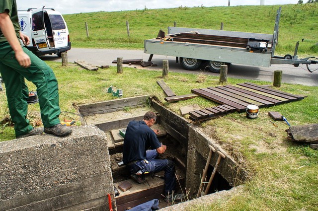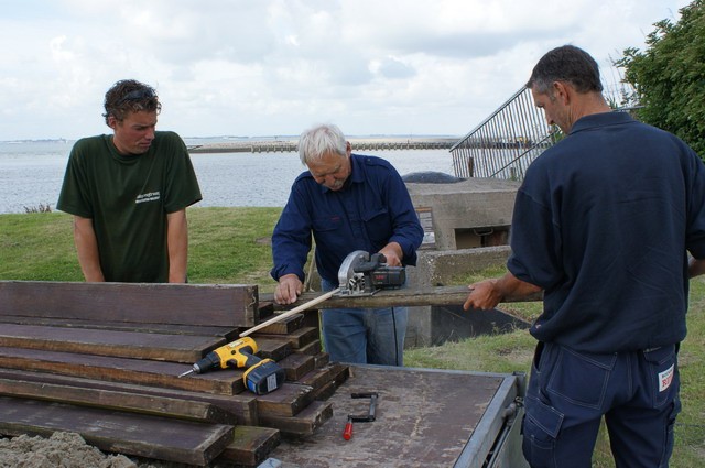 Nieuwe hardhouten planken worden op maat gezaagd.