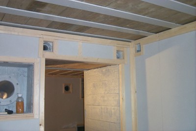 De muur naar de koepelkamer. Alle uitsparingen worden, zoals het ooit was, met afdeklatjes afgewerkt.