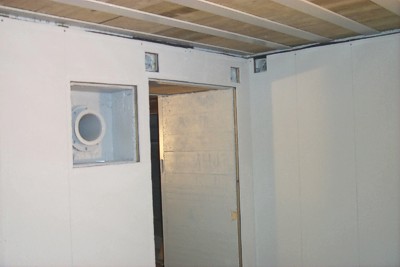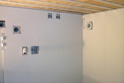 De wand in de Bereitschaftsraum, waarop straks alle techniek terugkomt, is al voorzien van de raggels.