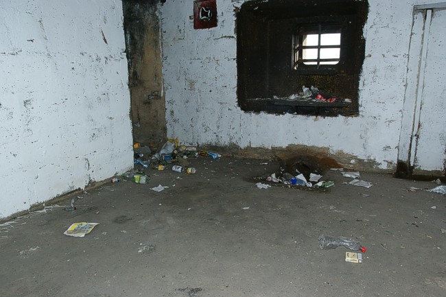 Nog wat vuil afvoeren, dat kunnen we wel bij de nooduitgang kwijt.