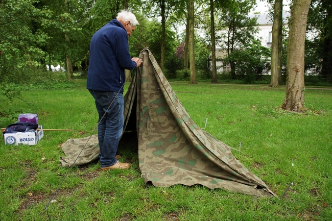 Casper bouwt het soldatententje op.