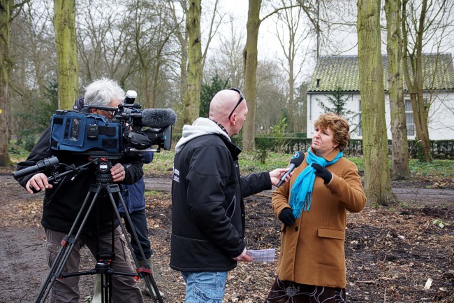 De wethouder Saskia Szarafinski staat de televisieploeg te woord.