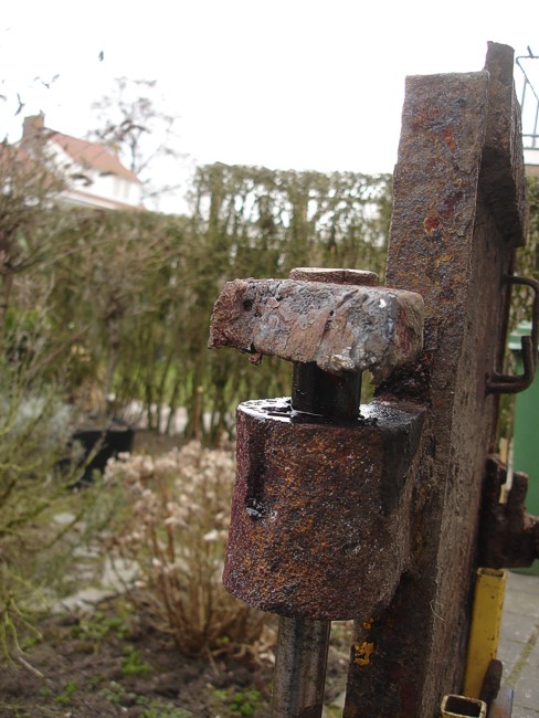 De bovenste scharnierpen gaf zich eenvoudiger gewonnen.