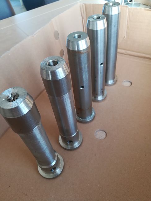 De aangepaste pennen staan klaar. Aan de zijde met de schroefdraad komt een smeernippel.
