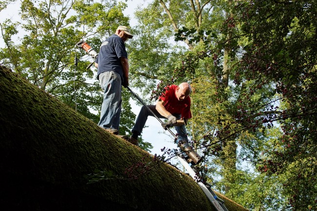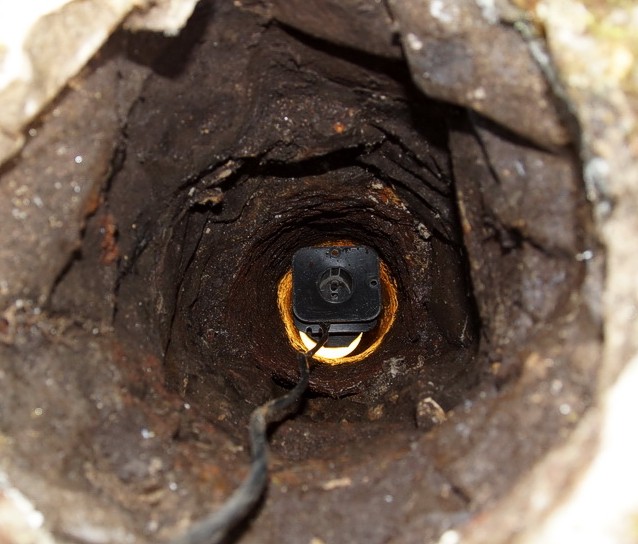 Via de schoorsteenopeningen lekt regenwater naar binnen. Er zijn replica schoorstenen
