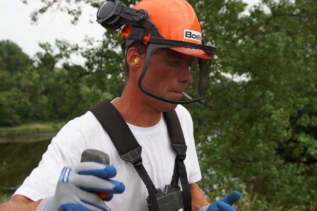 Goed beschermd: helm, handschoenen, oordoppen, gelaatsmasker en de peuk.