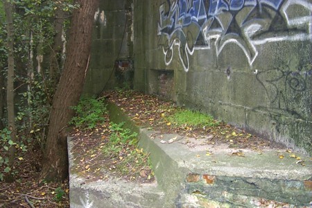 Een laatste foto van de bunker tussen de bomen.