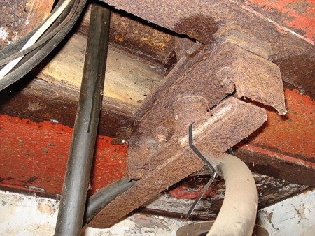 Veel details van de nooduitgang. De klimijzers zitten in de schacht. De pijp voor de afvoer van