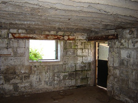 Boven de uitkijk zit een stalen balk. Let even op de zwarte gerafelde